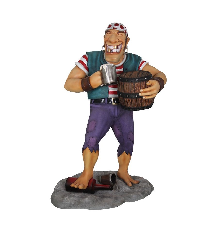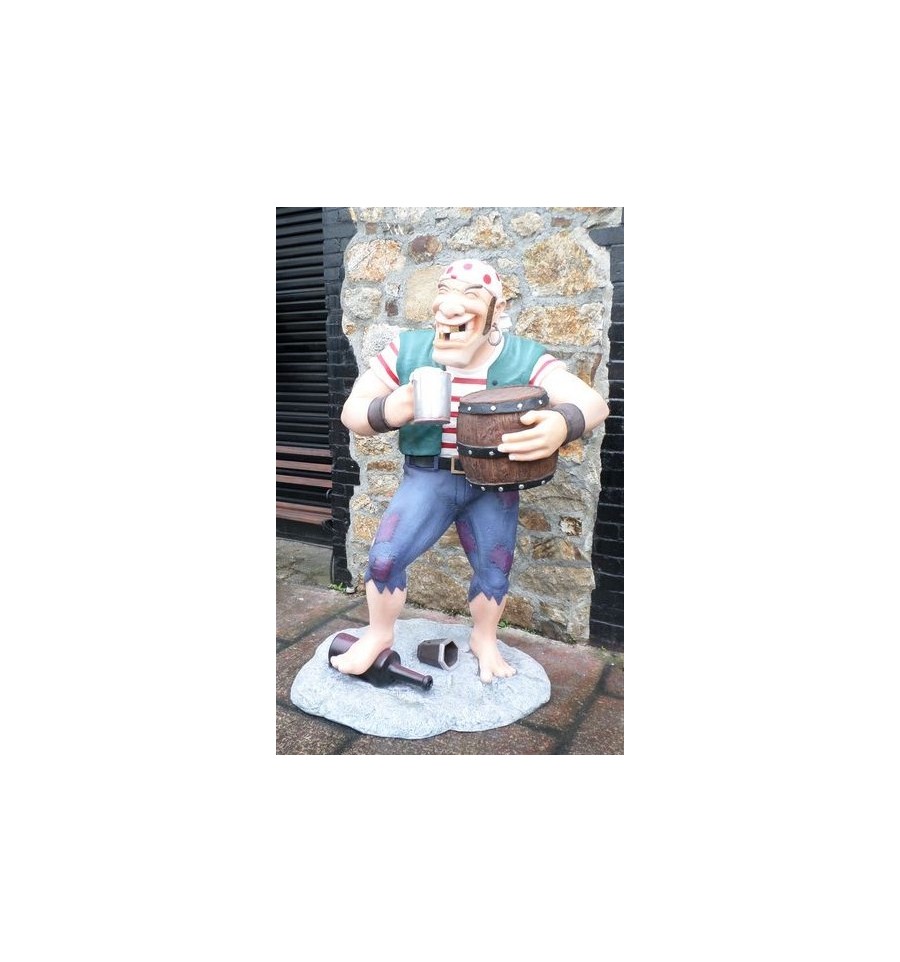 AMAZING AND FUNNY REPRODUCTION OF A CARTOON PIRATE, WITH EYE PATCH, GOLD TEETHS, STEPPING ON A BOTTLE OF RUM. A REAL SIZE PIRATE STATUE. PIRATE WITH A BARREL OF RUM.