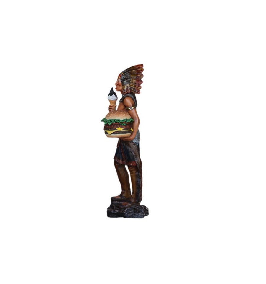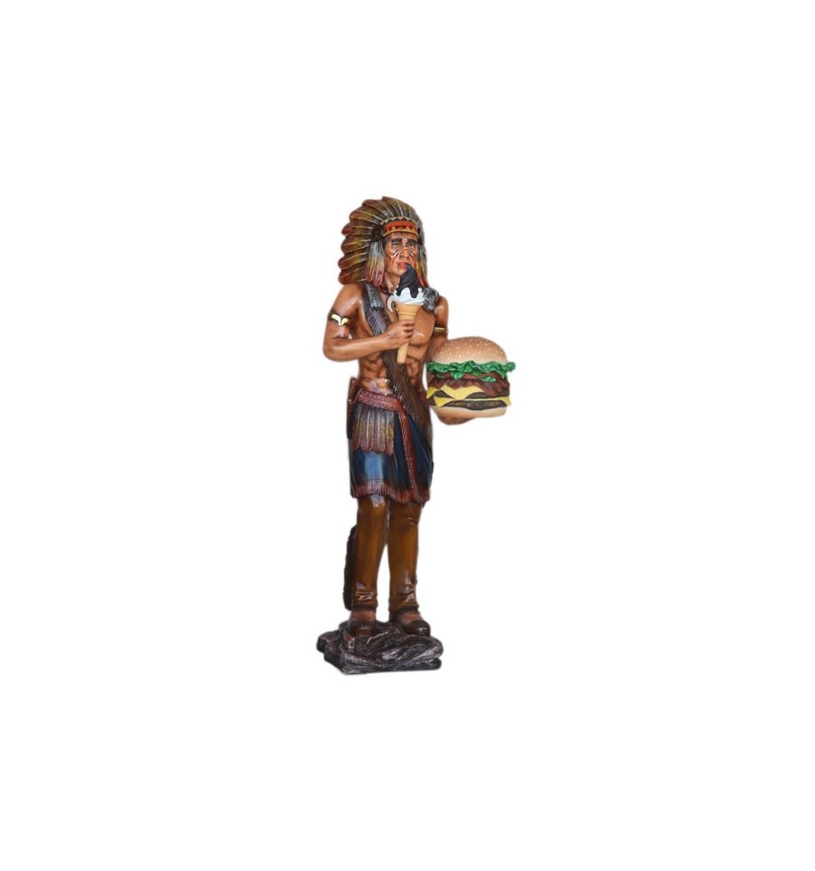 STATUE D EUN INDIAN CHIEF WITH A PLUME OF FEATHERS, EATING AN ICE-CREAM AND HOLDING A DELICIOUS BURGER MET... INDIAN WITH HAMBURGER AND ICE CREAM CONE SOFT