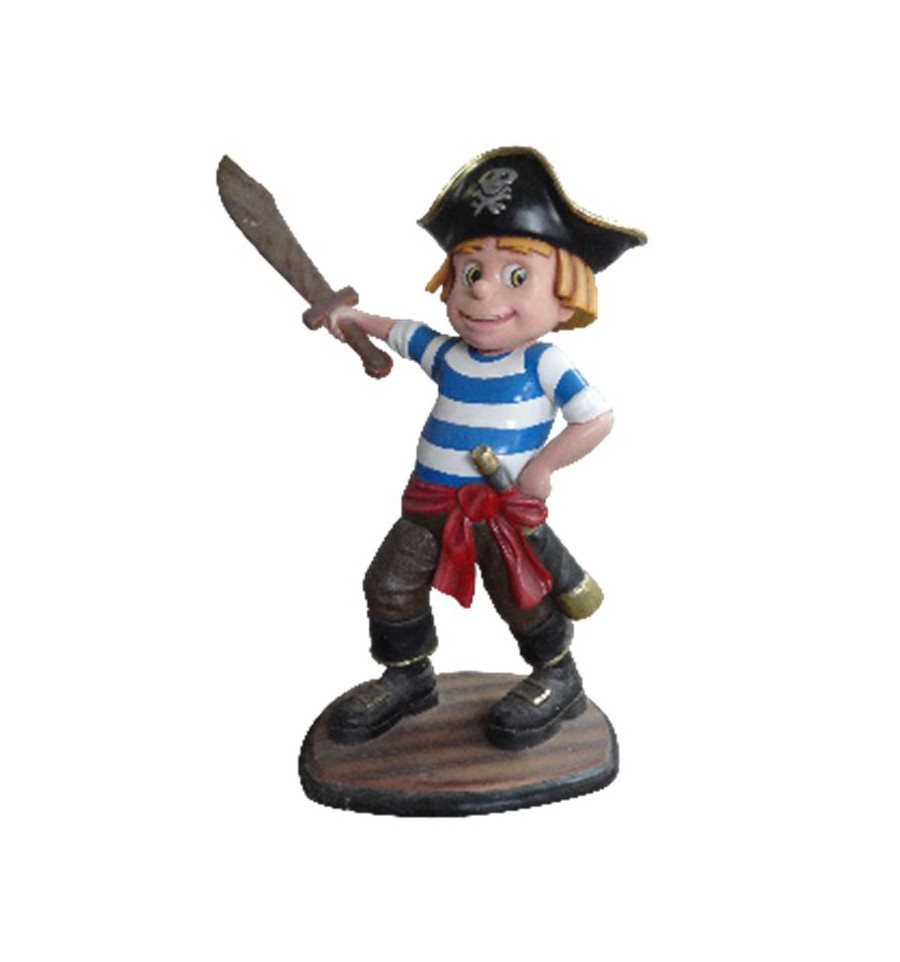 REPRODUCTION OF A PIRATE, A PIRATE BOY WITH HIS WOODEN SWORD AND SPYGLASS. A FIGURE OF A PIRATE CHILD FIBER OR RESIN TO DECORATE CHILDREN'S PLAYGROUNDS.