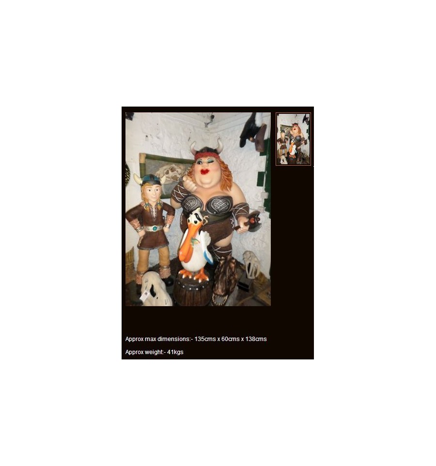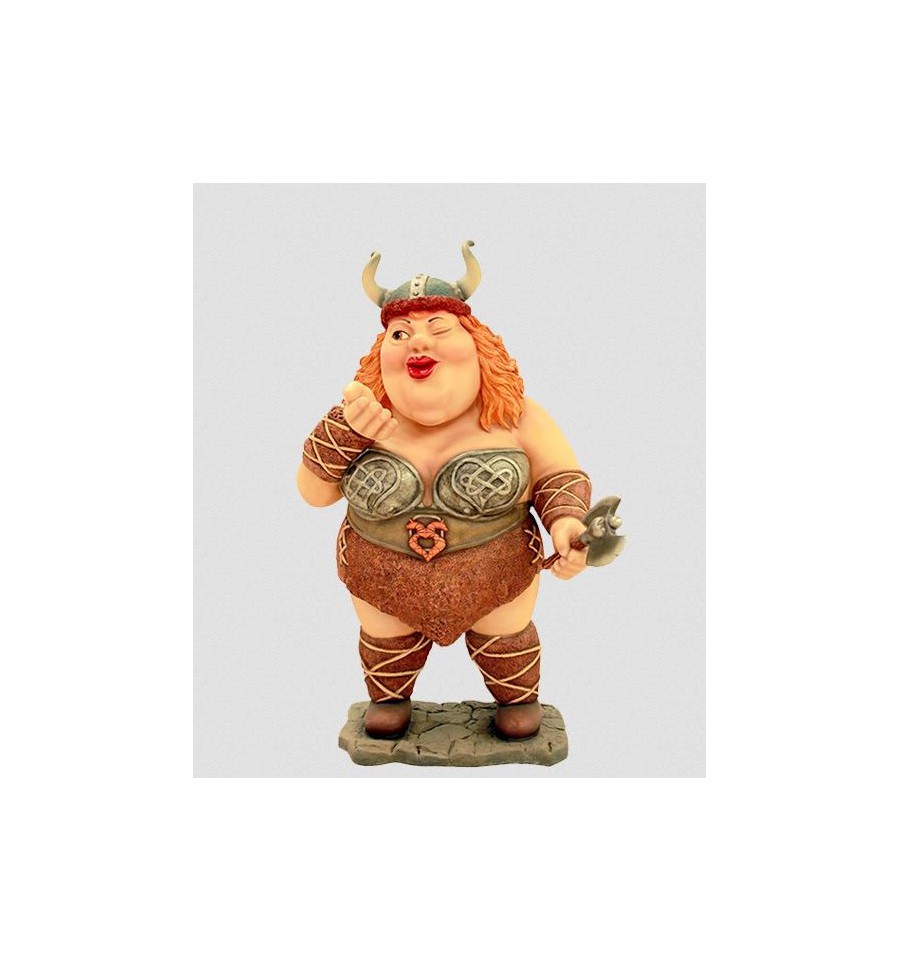 STATUE OF A FUNNY VIKING WOMAN. REPLICA OF A FEMALE VIKING CARTOON. REPRODUCTION OF A FEMALE VIKING WITH HIS HELMET, AXE AND LEATHER DRESS.