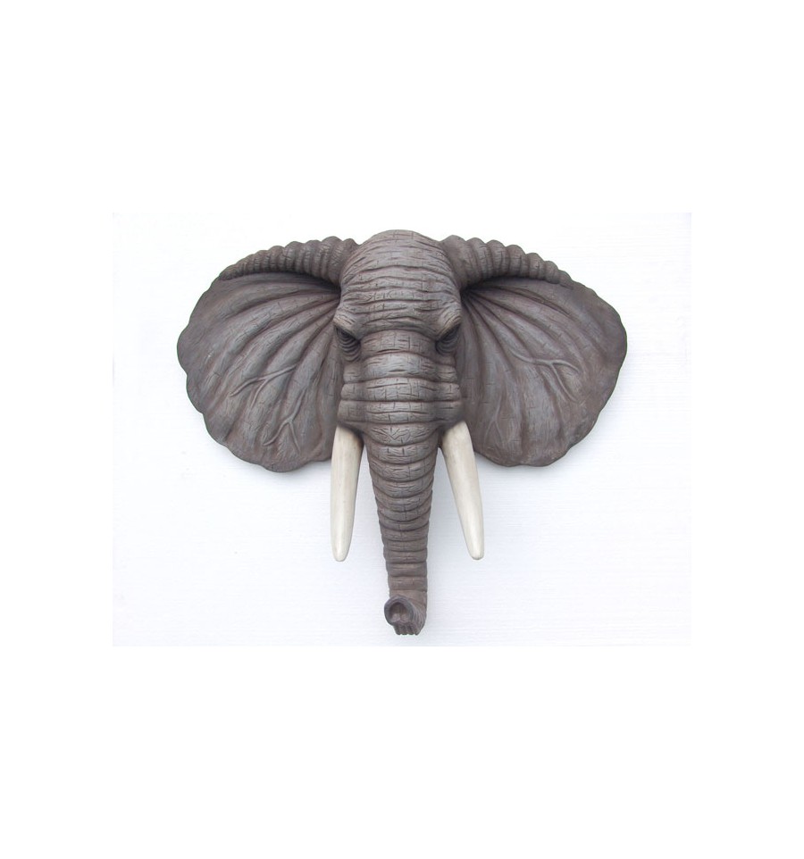 Imponente cabeza decorativa de elefante africano, diseñada con gran realismo en las arrugas de la piel, la textura de las orejas y los colmillos blancos característicos. Una pieza que transmite fuerza, elegancia y naturaleza salvaje.