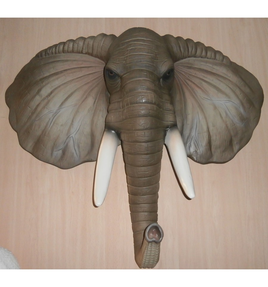 Cabeza de elefante africano decorativa, ideal para tematización safari, decoración rústica y espacios exóticos.