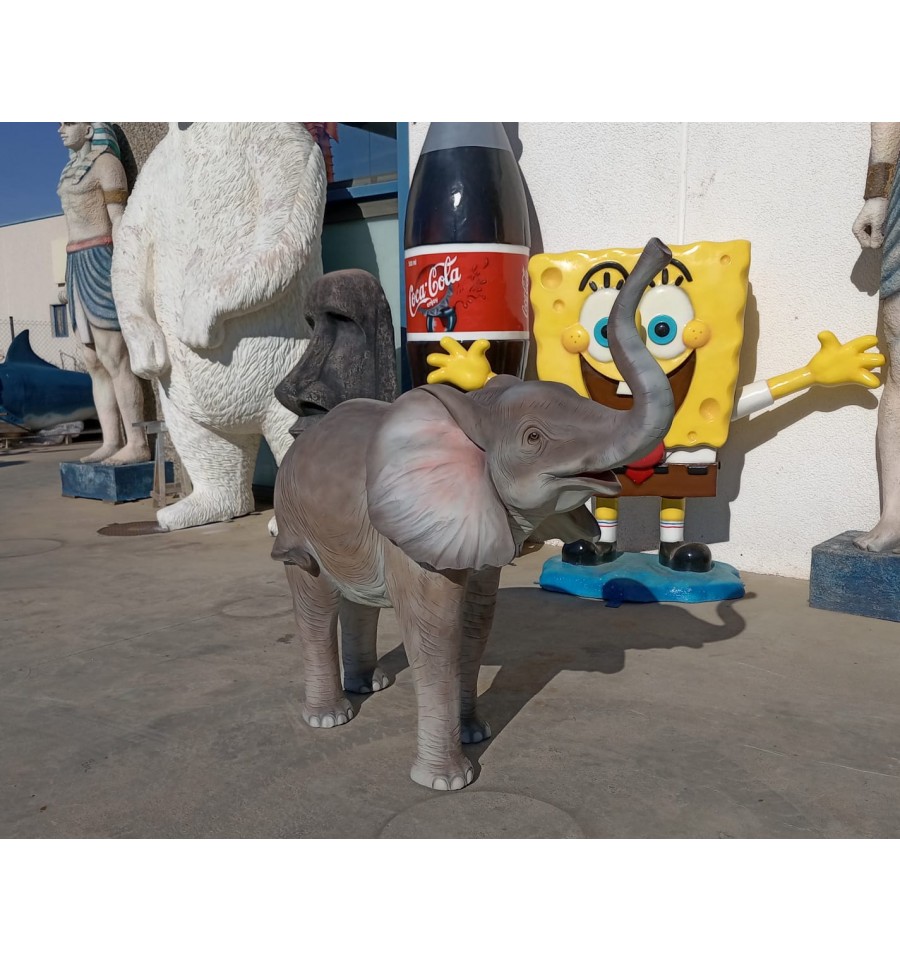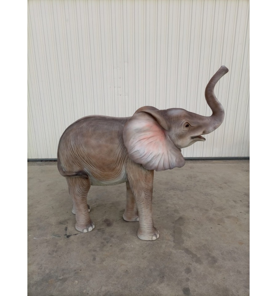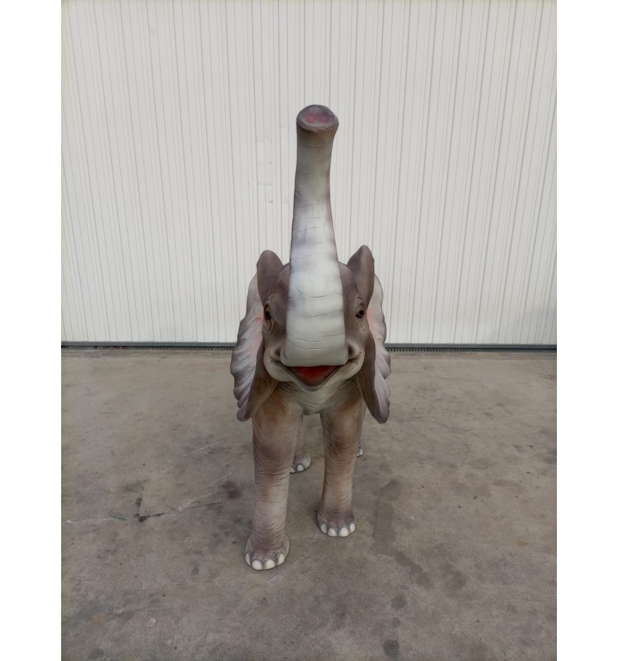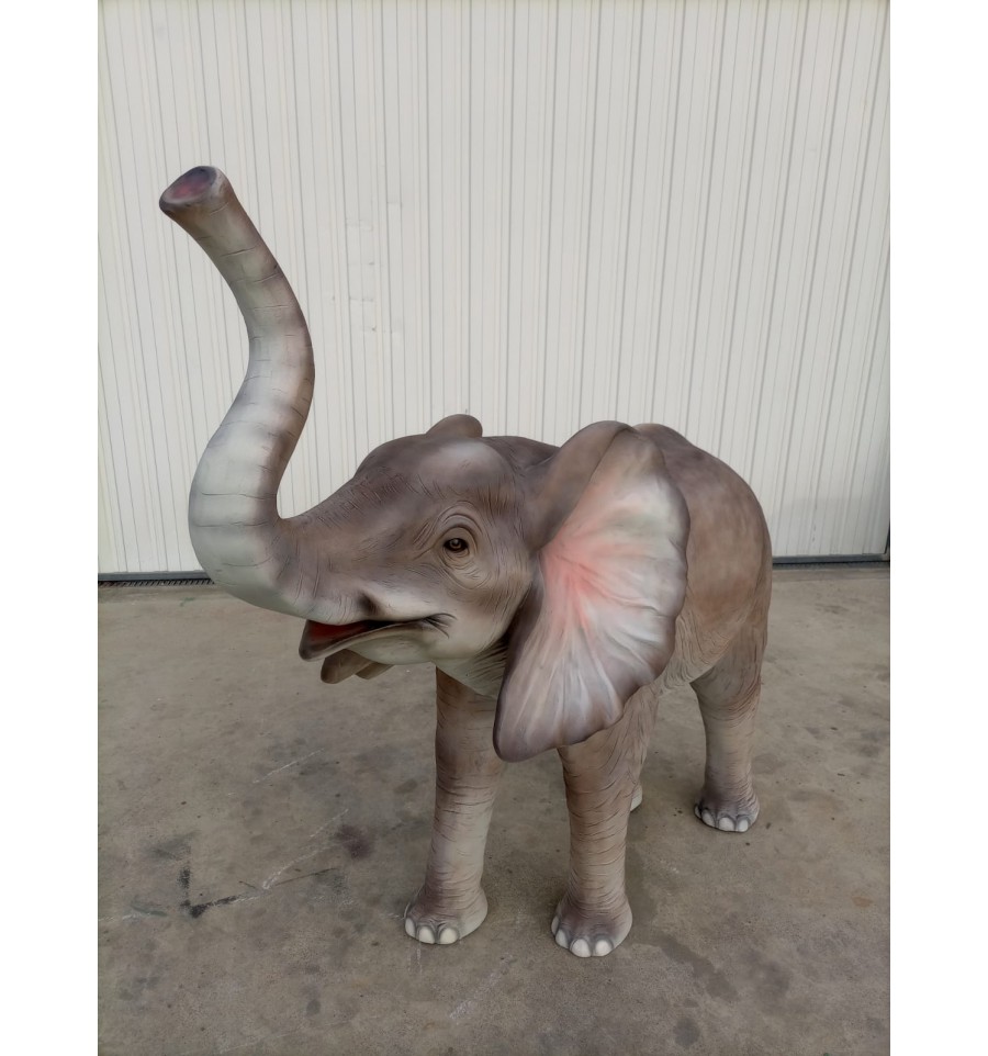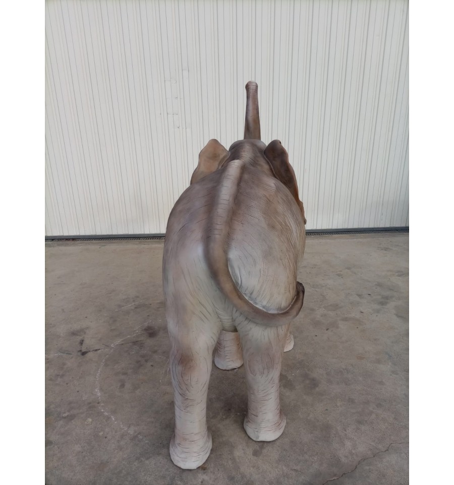 Replica decorativa de un cría de elefante en pie, ideal para decorar interiores y exteriores con un toque exótico y elegante.