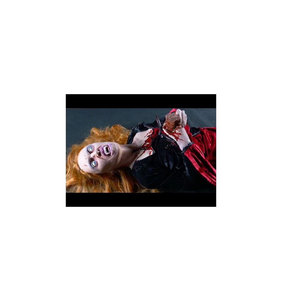 FIGURA QUE SIMBOLIZA A UNA VAMPIRESA ECHADA EN UNA CAMA, CON SUS CARACTERÍSTICOS COLMILLOS Y UNA MADERA CLAVADA EN EL PECHO