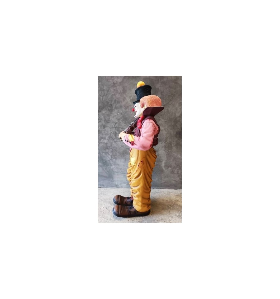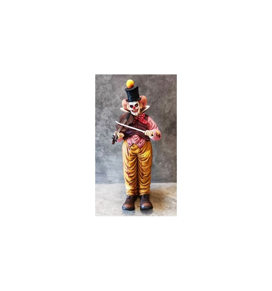 Reproducción de un payaso terrorífico con un violín y un cuchillo. Pieza ideal para eventos durante el Halloween o fiestas terroríficas.